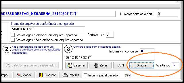 Novas modificações da opção de simular resultados, agora o usuário consegue carregar um jogo e gerar resultados simulados aleatoriamente, com as dezenas que ele jogou, definindo um numero de acertos que ele gostaria de testar ou gerar aleatoriamente resultados com os números da loteria.