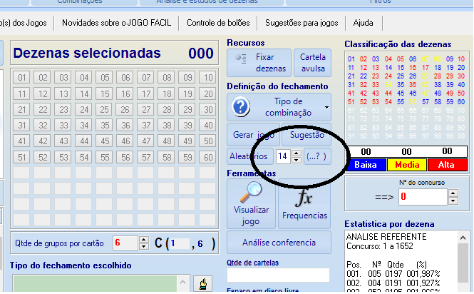 Agora o usuário também pode solicitar ao software sugestão de dezenas baseadas no "n" últimos concursos, para gerar s sugestão é necessário utilizar pelo menos os 5 últimos concursos, mas pode ser configurado pelo usuário. Informe a qtde de dezenas desejada e as mesmas serão marcadas na tela.