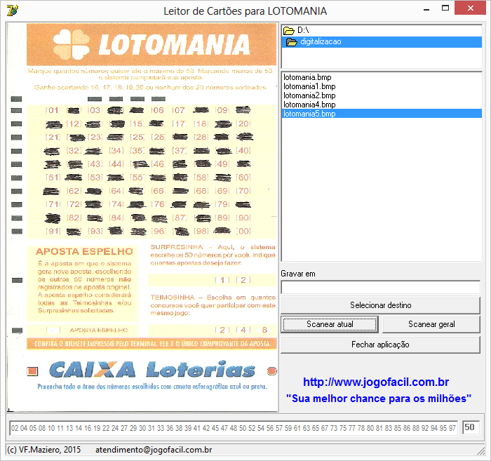 Leitor é um software onde o usuário digitaliza suas cartelas no formato bmp e o software ira ler as cartelas digitalizadas e gerar um único arquivo com todos os jogos lidos. Para isso as cartelas devem estar pintadas com tinta preta conforme o modelo do software.